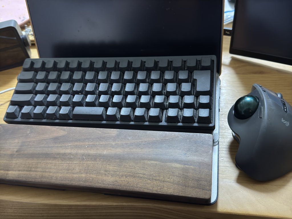 いかが尊師スタイル。MacなどPCの上にキーボードブリッジを置きHHKBとアームレストを配置します。