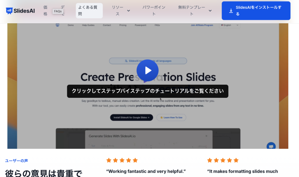 こちらのSlidesAIのサイトにアクセスし、右上のSlidesAIをインストールをおしてください。
