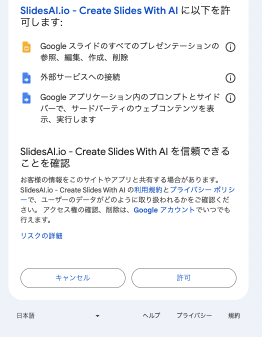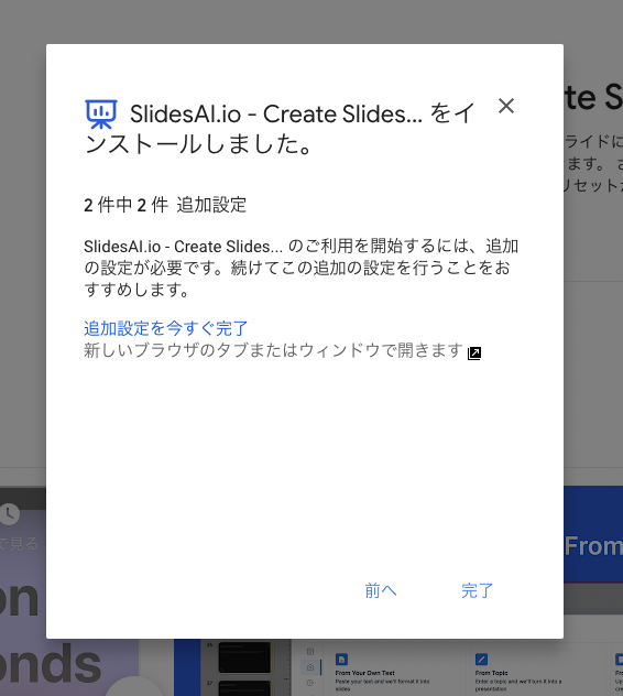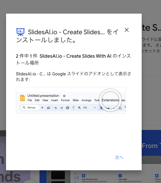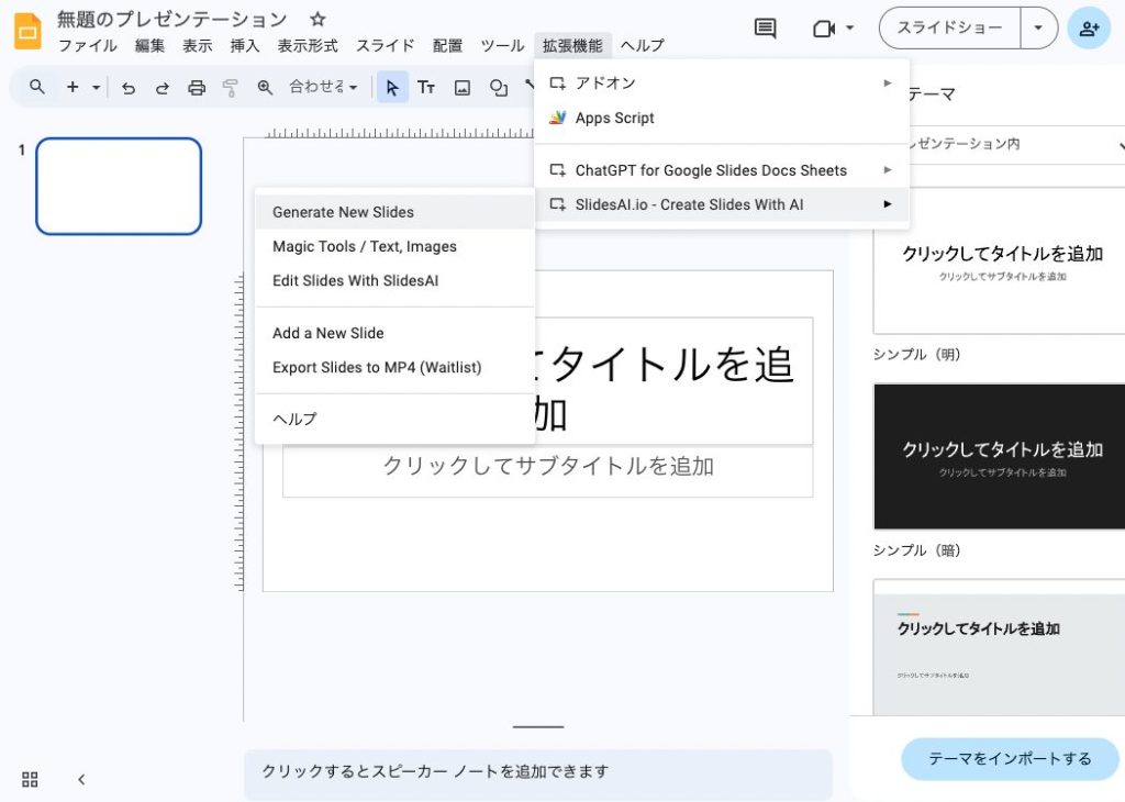 そうすると、googleスライドの拡張機能から、SlidesAIが選べるようになっています。