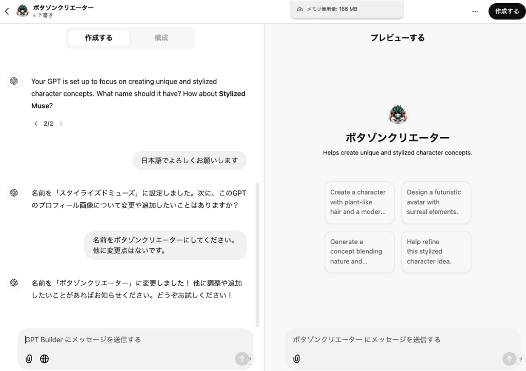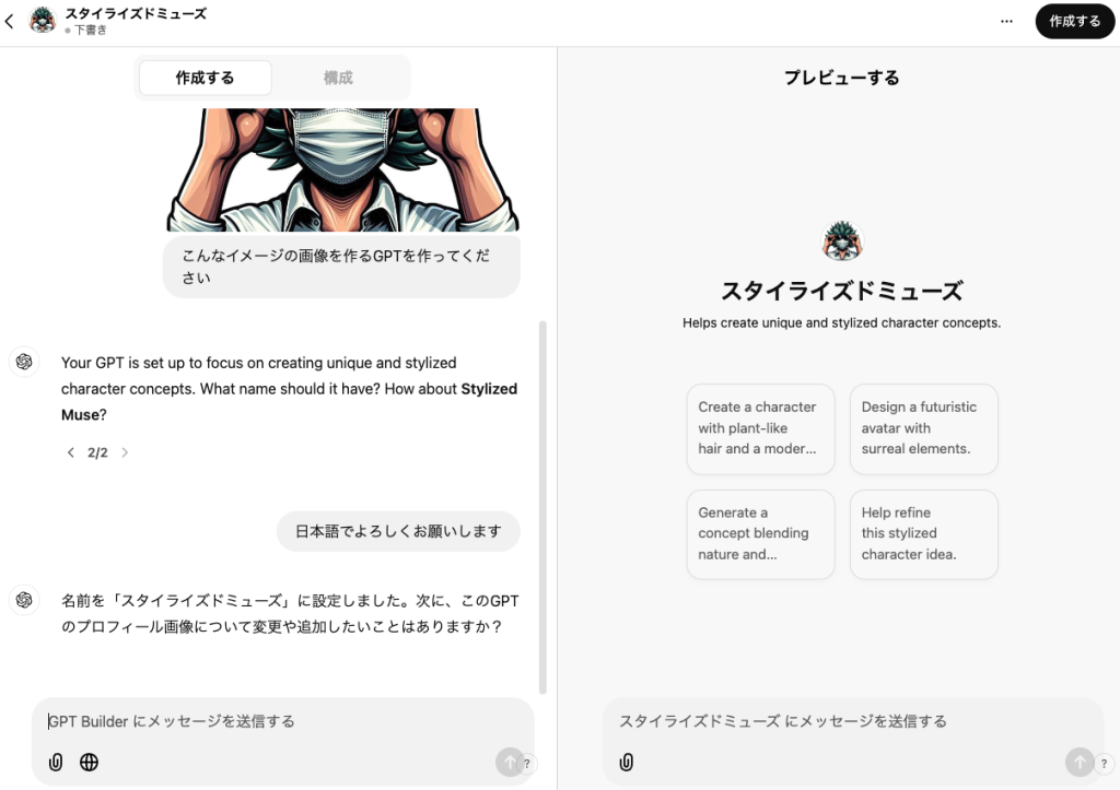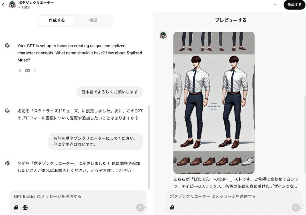 今回私は、全身の画像が欲しかったのでぼたぞんクリエイターという、私のアイコン風の画像を作るMy GPTsを作ってみようと思います。