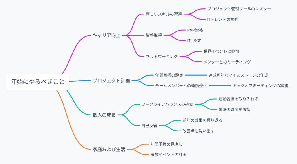 私はIT系のプロジェクトマネージャーで、仕事ができるようになりたいと思っています。また、今は年末です。年始にやるべきことをマインドマップ形式でまとめてください